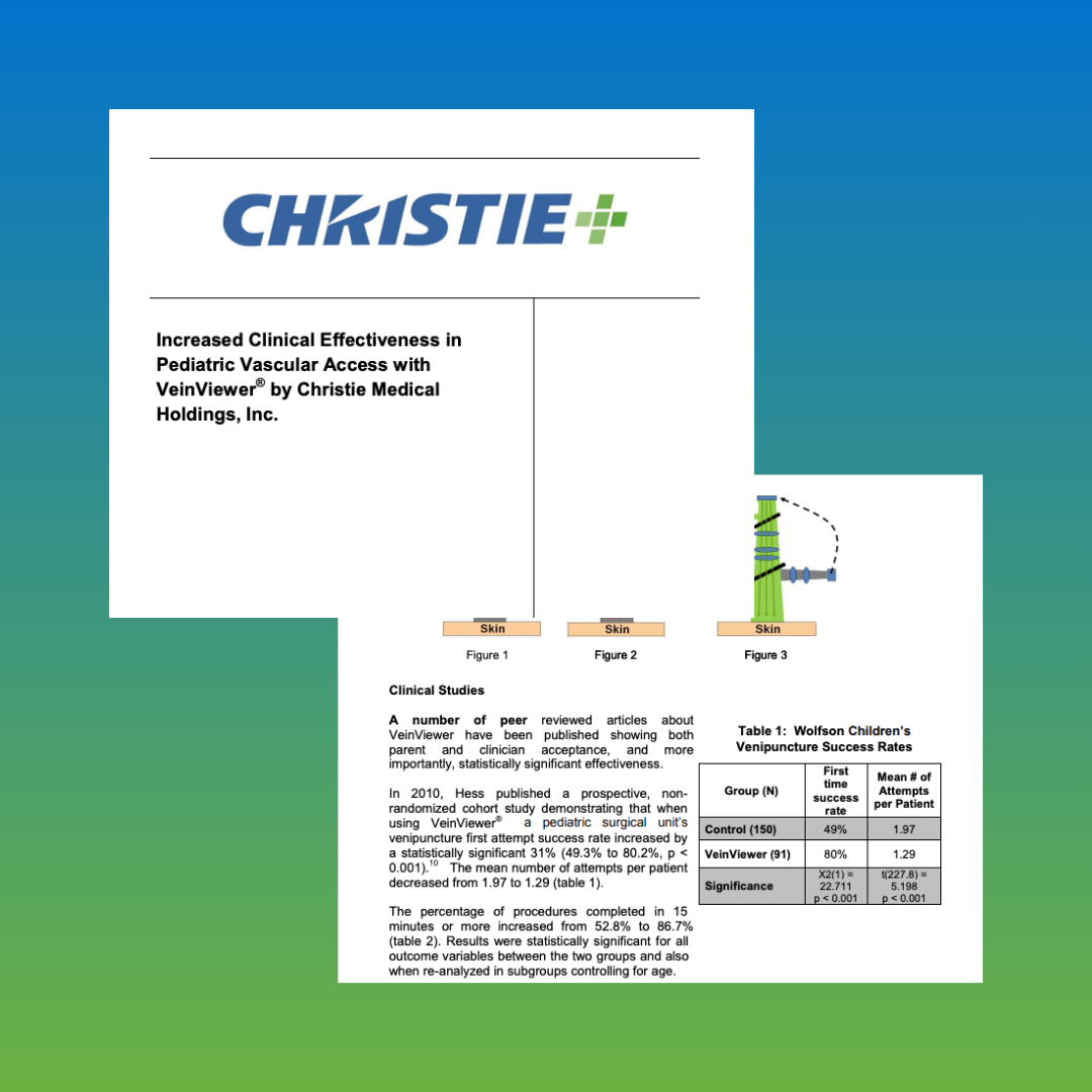 VeinViewer showed a statistically significant increase in the percentage of first stick success rates on difficult venous access pediatric patients in a randomized controlled study.